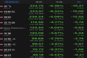 盘面上看,大型科技股多数下跌,奈飞跌超6%,微软跌超5%,亚马逊、Meta跌超4%,苹果跌3.67%。
