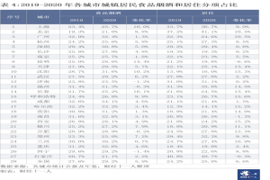 2019年全国城市居民平均值为27.6%,而占比最高的两个城市为成都和哈尔滨,数值分别为32.6%和32.2%。2020年,全国城市居民平均值为29.2%,而占比最高的两个城市仍然为成都和哈尔滨,数值分别为34.1%和33.2%。
