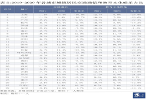 2019年全国城市居民平均值为11.9%,而占比最高的两个城市为南京和长沙,数值分别为18.8%和18.6%。2020年,全国城市居民平均值为9.6%,而占比最高的两个城市仍然为南京和长沙,数值分别为16%和18.3%。经常有人说长沙人民非常注重娱乐消费,这里的数据可以支持这个观点。