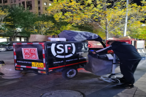 市北区双峰路上,晚上7点多,快递员还在分发快递。
