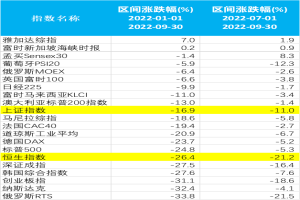 图:2022年前三季度全球主要股票指数涨跌幅