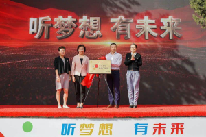 【中国儿童少年基金会秘书长张彦红、音乐之声节目部主任 章莹莹、一汽奥迪销售有限责任公司公关总监盛勇鑫、北京妇女儿童发展基金会秘书长王健共同为“听见梦想——校园广播站”揭牌】