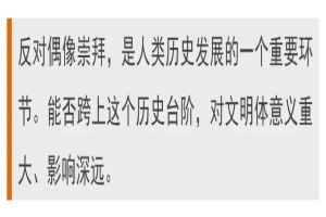 纵观人类文明史,会发现一个明显规律:文明体的整合,向高级阶段发展,必须跨上的台阶是:“打造共同信仰”。也就是要用统一的信仰体系,取代远古以来流传下来的泛神信仰。