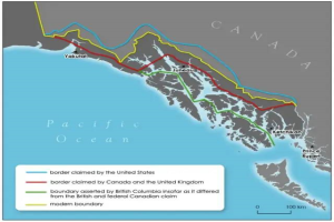 大概就是这样:红线和黑线(现代边界)之间的土地后面又给回英国以换取阿拉斯加湾东部沿岸地区