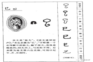 与“以”极为相似的是“巳”(sì),只不过甲骨文“巳”是“以”的倒文,即头朝下的胎儿,表示已经成型、即将降生(见上图)。