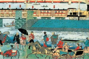 在经济上,全面引进西方近代工业技术,允许土地自由买卖,统一货币并于1882年设立日本银行(中国直到1908年才设立第一家银行大清银行),撤消工商业界的行会制度和垄断组织。大力兴建新式铁路、公路,在1872年就在日本横滨至东京之间修建了第一条铁路(那时候中国还在思考“烟伤庄稼,震动寝陵”)。