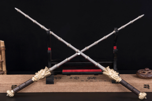 从以上说法来看,材质、数量和形状应该没有 问题。铜鎏金和凹面这些工艺很普通,唐之前一千多年的越王剑的工艺也远比这复杂,双刀、双剑、双棒都不稀奇,双锏也没什么了不起。所以怀疑集中在重量和结构上。而这两点由于时过境迁,史料散佚,真实性确已无从查考。