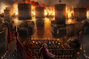 周瑜根据黄盖提出的诈降与火攻计,用火攻的办法大败曹操,一把大火就把曹操统一天下的野心烧了个精光,孙刘联军在随后的一年中攻取了曹仁驻守的江陵城,曹军退守襄阳,孙权、刘备、曹操三家鼎立的局面先在荆州形成,转而扩散到全天下。