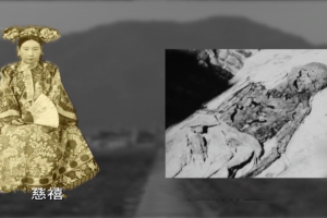 定东陵惨烈更盛,墓室西北角,孝钦显皇后(慈禧)遗体背卧于仰置之椁盖上,上身坦露,附体之衣被扒光,白皮贴骨,呈现拳头大小斑痕数块。惨无人道之状目不忍睹,笔难尽述。”
