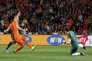 2010年世界杯,荷兰对阵西班牙的比赛。加时赛,伊涅斯塔的进球,荷兰0-1不敌西班牙,再次屈居亚军。