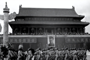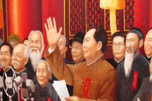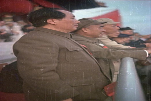他们一边举着红旗,一边高呼:“中华人民共和国万岁!毛主席万岁!”听到人民群众的欢呼和呐喊,毛主席激动地连连挥手,在天安门城楼上的扩音机前回应着:“同志们万岁!人民万岁!”
