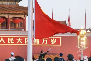 在一片欢呼声中,《义勇军进行曲》缓缓响起,我国第一代护旗手将一面鲜艳的五星红旗扛在肩头,在所有人的注视下,新中国第一面五星红旗冉冉升起。会场上全部军人行军礼,其余人行注目礼。