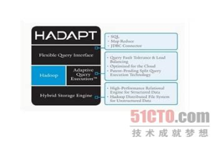 Hive是在Hadoop上运行的Apache数据仓库组件,它一向以速度慢而出名。这时候,Hadapt上场了,它提供了一体化的分析环境,旨在对Hadoop里面的数据执行分析操作,还能对SQL环境中传统的结构化数据进行分析。Hadapt公司表示,通常采用的方法是使用由扩充型连接件联系起来的两个不同系统,但是这带来了延迟,因而导致这种方法显得很孤立。而Hadapt的平台设计成了可以在私有云或公共云环境上运行,提供了从一个环境就能访问所有数据的优点,所以除了MapReduce流程和大数据分析工具外,现有的基于SQL的工具也可以使用。Hadapt可以在Hadoop层和关系数据库层之间自动划分查询执行任务,提供了Hadapt所谓的优化环境,这种环境可以充分利用Hadoop的可扩展性和关系数据库技术的快速度。