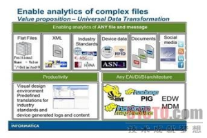 许多数据集成和数据管理厂商(IBM、甲骨文、Syncsort和Talend)处理的是很明显的任务:让数据进出Hadoop。Informatica公司在去年10月则更深入一步,当时它推出了HParser,这是一种针对Hadoop而优化的数据转换环境。据Informatica声称,软件支持灵活高效地处理Hadoop里面的任何文件格式,为Hadoop开发人员提供了即开即用的解析功能,以便处理复杂而多样的数据源,包括日志、文档、二进制数据或层次式数据,以及众多行业标准格式(如银行业的NACHA、支付业的SWIFT、金融数据业的FIX和保险业的ACORD)。正如数据库内处理技术加快了各种分析方法,Informatica同样将解析代码添加到Hadoop里面,以便充分利用所有这些处理功能,不久会添加其他的数据处理代码。
