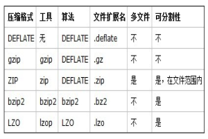压缩算法 原始文件大小 压缩后的文件大小 压缩速度 解压缩速度 gzip 8.3GB 1.8GB 17.5MB/s 58MB/s bzip2 8.3GB 1.1GB 2.4MB/s 9.5MB/s LZO-bset 8.3GB 2GB 4MB/s 60.6MB/s LZO 8.3GB 2.9GB 49.3MB/S 74.6MB/s