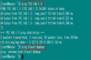 例如:机器为"Master.Hadoop:192.168.1.2"对机器为"Salve1.Hadoop:192.168.1.3"用命令"ping"记性连接测试。测试结果如下: