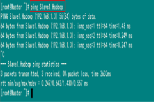从上图中我们已经能用主机名进行ping通了,说明我们刚才添加的内容,在局域网内能进行DNS解析了,那么现在剩下的事儿就是在其余的Slave机器上进行相同的配置。然后进行测试。(备注:当设置SSH无密码验证后,可以"scp"进行复制,然后把原来的"hosts"文件执行覆盖即可。)