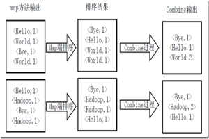 3)得到map方法输出的<key,value>对后,Mapper会将它们按照key值进行排序,并执行Combine过程,将key至相同value值累加,得到Mapper的最终输出结果。如图4-3所示。