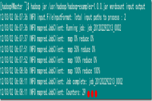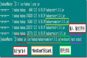 已经编译好的WordCount的Jar在"/usr/hadoop"下面,就是"hadoop-examples-1.0.0.jar",所以在下面执行命令时记得把路径写全了,不然会提示找不到该Jar包。