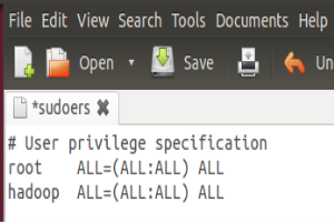 3. 给hadoop用户添加权限,打开/etc/sudoers文件: