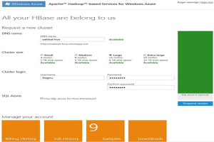 2011年12月14日SQL Server大数据团队发布了Apache Hadoop on Windows Azure服务商业技术预览(CTP)版本的邀请码,该团队期望在2012年初公诸于众。微软同Hortonworks合作,创建服务,提供核心的Hadoop/MapReduce功能、JavaScript库,可以用JavaScript编写MapReduce程序,用标准的Web浏览器运行工作,以及一个交互的JavaScript/Hive 控制台来编写和执行HiveQL声明。分析师使用Excel和其他的微软商业智能(BI)工具可以下载一个Hive ODBC驱动和Excel插件,允许他们用BI工具,比如PowerPivot和PowerView,发布HiveQL查询到分析结构或者非结构的Hadoop数据。预期AHoWA 用户必须通过邀请码邮件填写一个简要的调查。通过邀请码登录到AHoWA 网站,打开Request a New Cluster 页面(图三所示)。在预览期间没有AHoWA 资源消耗费用。然而,集群48小时候回收;你可以在24小时内重新创建一个,其生命周期持续6小时。