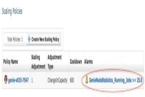 通过使用Asgard,同样可以为动态负载设置扩展策略。下方的截图就是一个简单的策略,一旦所有实例上的平均作业数量大于25就会自动开启一个Genie实例。