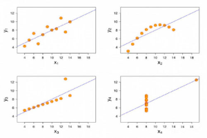 上述的每个数据集,所有X坐标的平均值都是9,Y坐标的平均值为7.5, X坐标的方差是11,X与Y的相关性是0.816, 且最优拟合线的公式是Y = 3 + 5x。