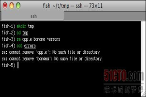 在命令 3 中,rm 产生的错误消息被重定向到 errors 文件中。命令 4 显示此文件的内容。fish shell 为重定向提供各种支持,比如把描述符组合成一个流和结束描述符。