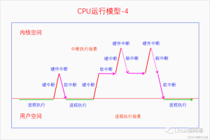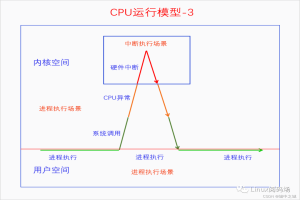 在CPU运行模型的基础上,CPU在用户空间执行进程,可以通过系统调用进入内核空间,也可能由于中断或者异常发生而进入内核空间,在内核空间里进程可以由于阻塞而主动发生进程调度,或者在定时器中断里面由于时间片耗尽而发生调度。