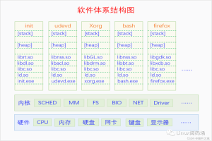 我们可以看到内核运行在硬件之上,进程运行在内核之上,有init等进程是作为操作系统的一部分共同维护整个系统的运行。内核里面包括进程调度、内存管理、文件系统、BIO层、网络模块、其它驱动等模块。进程是由一个exe主程序和n个so库程序组成。每个进程中的libc.so,ld.so等库程序都是属于操作系统的一部分。所有进程通过进程调度共享CPU、轮流执行。