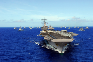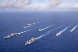 (美国海军双航母战斗群在演练的画面,它们将是美军介入的急先锋)