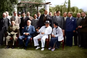 这是三国首脑合影时的历史画面,由于蒋介石不会讲英语他只能坐在那里赶苍蝇。而其夫人宋美龄则是与美英领导人侃侃而谈,据丘吉尔回忆说,我对蒋介石没什么印象,相反对他的夫人倒是印象深刻。