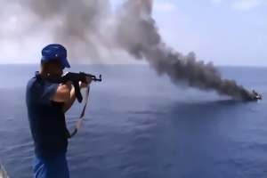 只要遇到可疑的海盗船只,俄罗斯海军立即发射炮火轰击一阵,随后又会用轻重武器狠狠“招呼”一番。