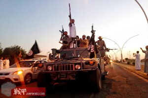 (2014年6月23日,照片中的伊斯兰国武装分子乘坐一辆被劫持的伊拉克安全部队的装甲悍马车在伊拉克摩苏尔的主干道上游行。)