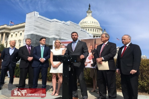加利福尼亚州共和党众议员邓肯·亨特(图中右起第三位)在国会山的一个集会上发表讲话,他支持爱德华·加拉格尔。和他在一起的是加拉格尔的妻子安德烈;左起第三位是他的哥哥肖恩(Sean),右二是北卡罗来纳州共和党众议员诺曼(Ralph Norman)。还有来自爱荷华州的共和党众议员史蒂芬·金。