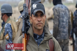 (2017年3月2日,在解放伊拉克西部摩苏尔的攻势中,一名伊拉克联邦警察在保卫的机场的附近街道上等待下一步行动。)