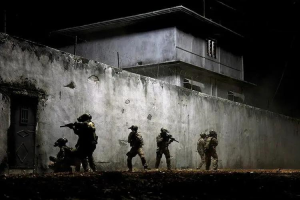 两架战斗机一前一后降落在阿伯塔巴德的一处隐蔽性极强的独栋别墅花园中,战斗人员训练有素地展开部署,对着别墅中的人开枪射击。