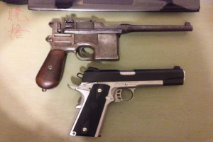 △ C96与M1911,C96的7.63×25mm的弹长比M1911的.45ACP更大