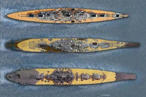 ▲从上到下分别为俾斯麦号,衣阿华号和大和号,可见大和号的粗短形态