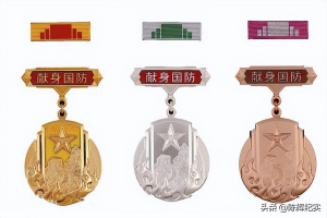 ——献身国防纪念章。此纪念章是中国人民解放军总政治部根据《中国人民解放军纪律条令》有关规定设计制作的,于2011年8月1日起全军正式启用的纪念章之一,是为了表彰牺牲或致残军人而专门颁发的纪念章。