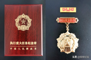 ——执行作战和重大任务纪念章。此纪念章分为执行作战任务纪念章和执行重大任务纪念章两种,纪念章附章和章体背面分别刻印每次执行作战任务或执行重大任务的具体名称。均由由主章(章体)、附章、略章、绶带以及附件组成。