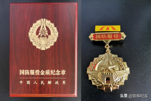——国防服役纪念章。此纪念章是由中国人民解放军总政治部根据《中国人民解放军纪律条令》的有关规定设计制作的,在2011年8月1日起全军正式启用的纪念章。