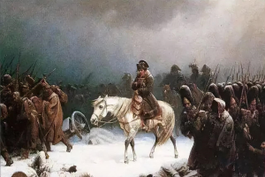 ▲风雪中前行的法军,1812年拿破仑错攻俄罗斯导致大败