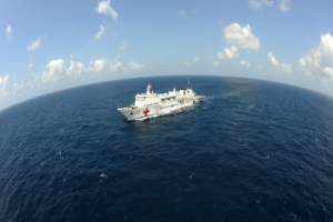 2015年10月1日,鸟瞰航行在阿拉弗拉海域的中国海军“和平方舟”号医疗船。 入列以来,该船远航三大洋六大洲,总航程24万余海里,相当于沿赤道绕地球11圈。 (江山/图)