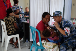2017年12月16日,在东帝汶阿陶罗岛维拉医院,中国海军“和平方舟”号医疗船儿科医生张传仓正为岛上儿童诊疗。应东帝汶政府请求,“和平方舟”组织33人的医疗分队,赴首都帝力之外约30公里的阿陶罗岛,为484名当地居民提供了巡诊服务。 (江山/图)