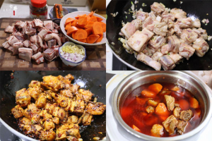 4、半小时后,排气放入胡萝卜块,再盖上锅盖炖煮15分钟左右,炖好后就可盛出。