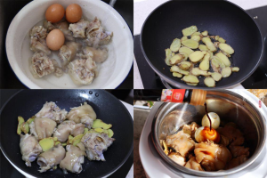 1、猪蹄清洗干净剁块,放进冷水锅里,倒入两勺料酒开火煮开,水开后再煮2分钟左右捞出用清水冲洗,猪蹄焯水时可顺带将鸡蛋放入锅中煮熟。生姜洗净切片,姜片可以多准备一些。