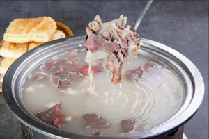再加入萝卜、葱姜等配料,继续翻炒,然后加入清水,等到萝卜跟羊肉炖煮熟后撒上食盐、胡椒粉等调味,再煮一会儿就能出锅。若是觉得太单调,还可以在里边加上些粉条,或是配上白吉馍,羊肉汤色白味美,吃起来十分鲜嫩。