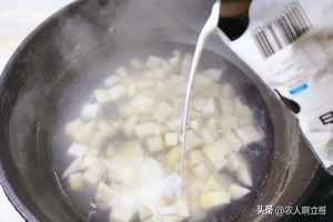 3、芋头和西米煮20分钟后,我们准备500毫升的牛奶倒入锅内,牛奶可以增加芋头粥的口感,鲜香美味。牛奶倒入后,再放入适量的白砂糖,我们继续小火煮5分钟,使牛奶和白糖融入到芋头和西米内,最后关火盛入碗内即可。一碗热腾腾,奶香味十足的芋头粥就煮好了,好喝又营养!