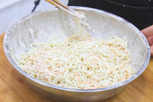 2.腌好的萝卜丝挤干水分,然后加入植物油拌匀后,再加入适量面粉拌匀抖散。